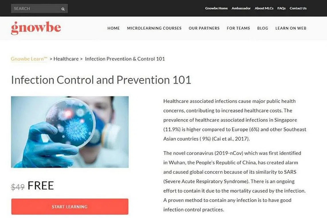 SEBUAH kursus dalam talian pendek mengenai kawalan dan pencegahan jangkitan telah dilancarkan semalam oleh Politeknik Ngee Ann (NP) bersama platform pembelajaran mikro Gnowbe.
