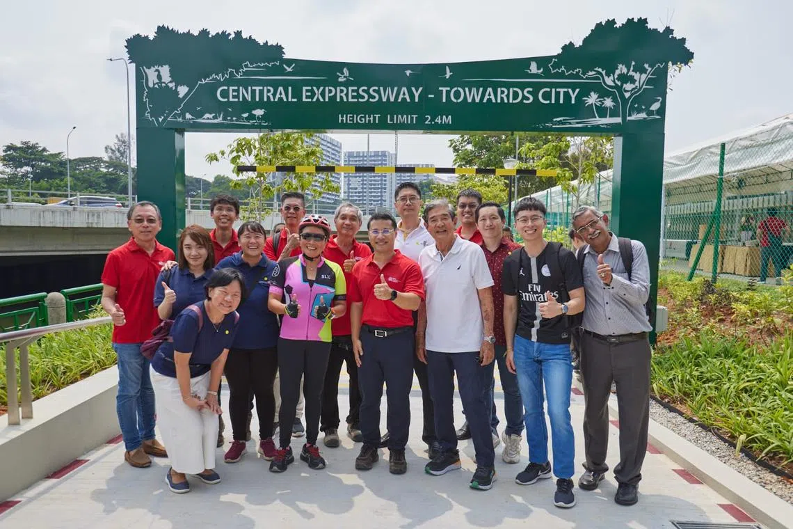 PEMBUKAAN RASMI: Menteri Pembangunan Negara, Encik Desmond Lee (tengah, depan) yang merasmikan pembukaan laluan penghubung tersebut, berkata projek Bishan ke bandar itu menyokong matlamat kemampanan negara dengan menyediakan perjalanan lebih hijau. - Foto FACEBOOK DESMOND LEE