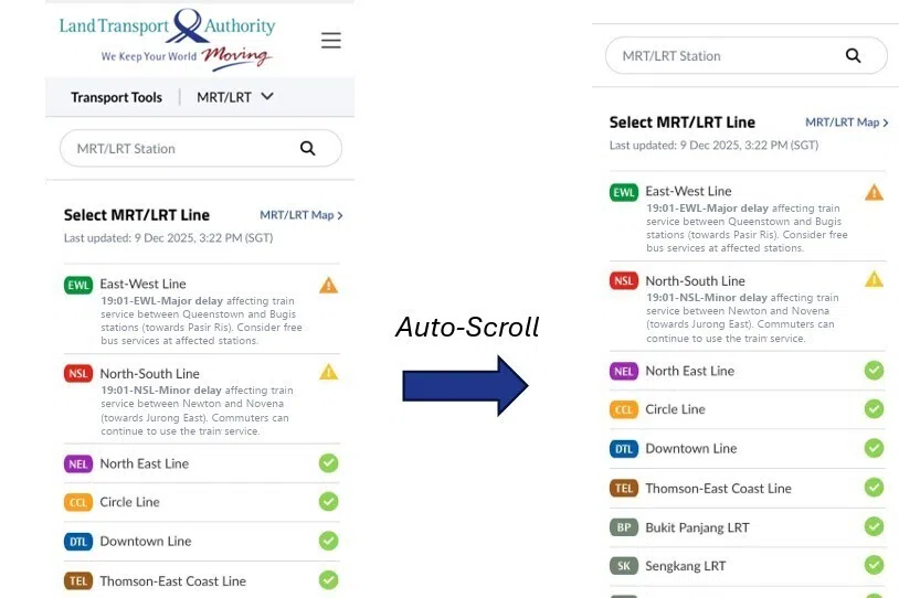 Menerusi laman web mytransport.sg/trainstatus, status setiap laluan MRT akan ditandakan mengikut warna di laman web LTA bagi menunjukkan sama ada perkhidmatan beroperasi seperti biasa atau terjejas oleh kelewatan.