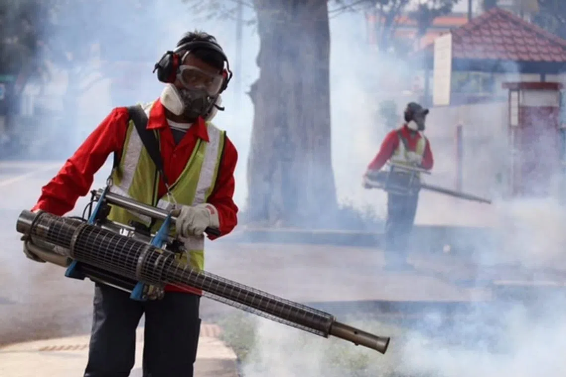 LANGKAH membasmi penularan virus Zika dilakukan dengan kakitangan pengawal serangga perosak dan pegawai dari Agensi Sekitaran Kebangsaan (NEA) melakukan pengkabutan di Simon Place berdekatan Kovan di Hougang, pagi tadi.