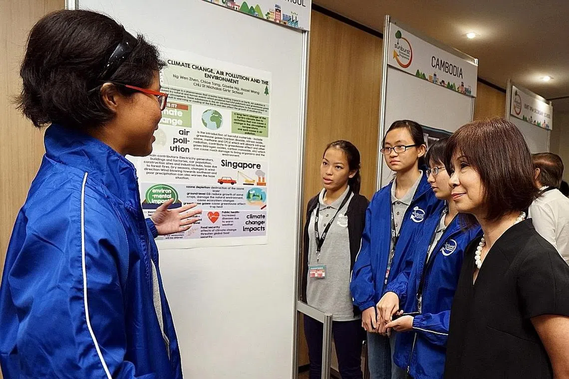 KONGSI ISU ALAM SEKITAR: Para pelajar Sekolah CHIJ St. Nicholas Girls mengongsi projek mereka dengan Dr Amy Khor (kanan) di majlis pelancaran Program Alam Sekitar Sunburst STEP-NUS 2016. - Foto STEP -