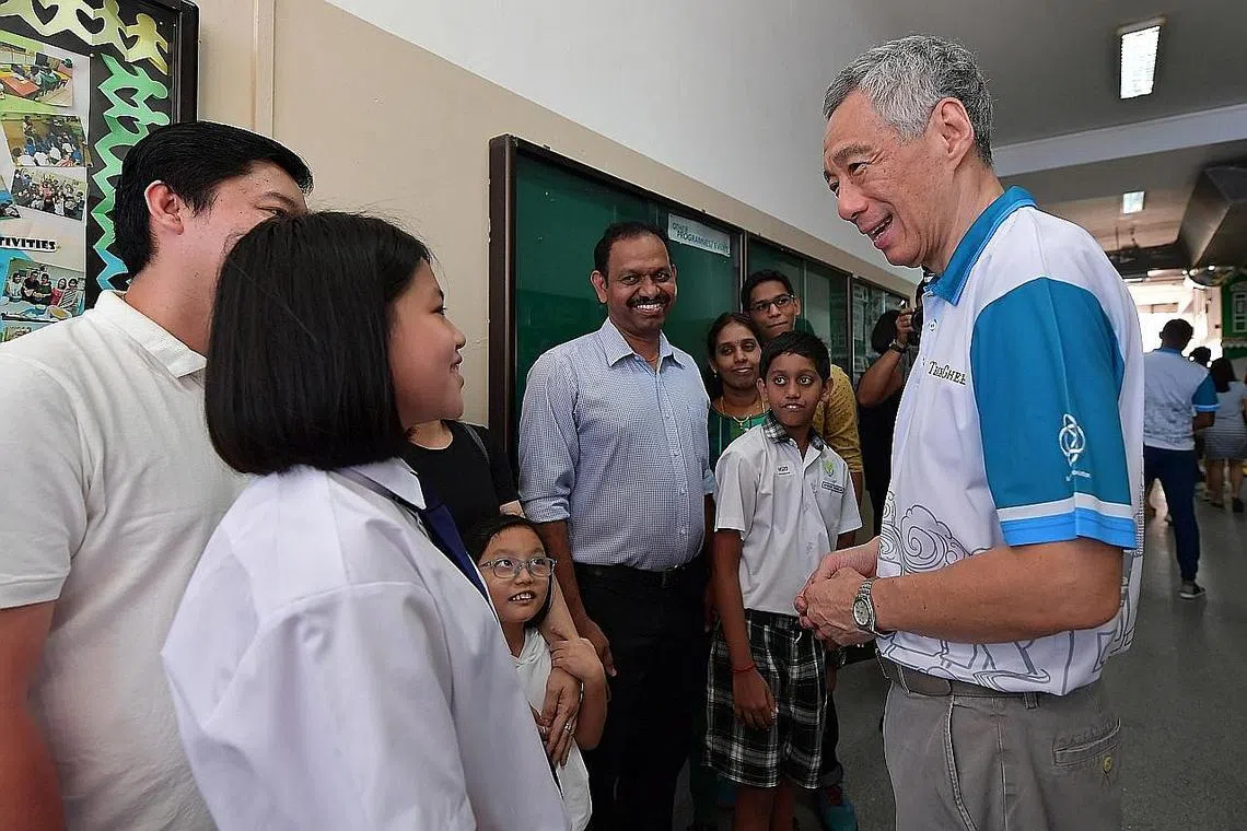 PENERIMA DERMASISWA: PM Lee berbual mesra dengan Samantha Ong (dua dari kiri) dari Sekolah Rendah Townsville dan Rivash Dhayalan (tujuh dari kiri) dari Sekolah Rendah Teck Ghee dan keluarga masing-masing. - Foto BH oleh NG SOR LUAN -