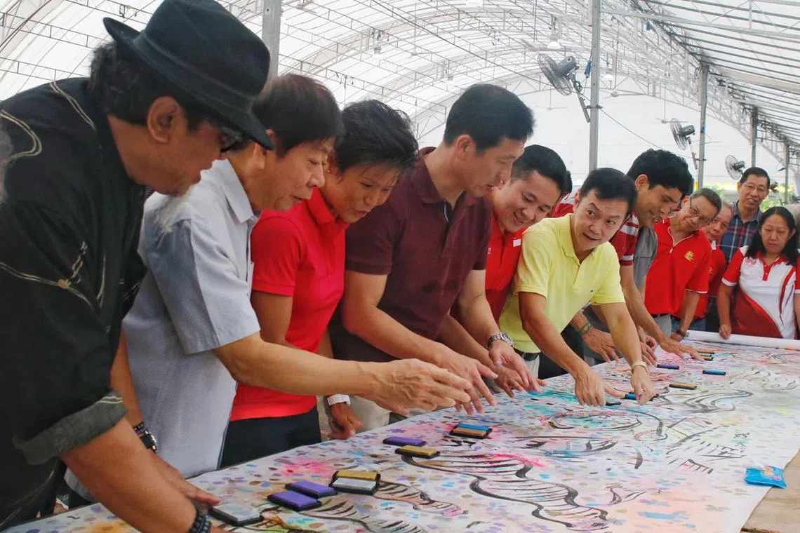 AKTIF SEPANJANG HAYAT: Encik Khaw (dua dari kiri), Encik Ong (empat dari kiri) dan Encik Amrin (lima dari kiri) mengecap cap jari mereka di kanvas lukisan seni Singapore Bicentennial, bersama pelukis Singapura Encik Rosihan Dahim (bertopi). - Foto BH oleh JEREMY KWAN JW -