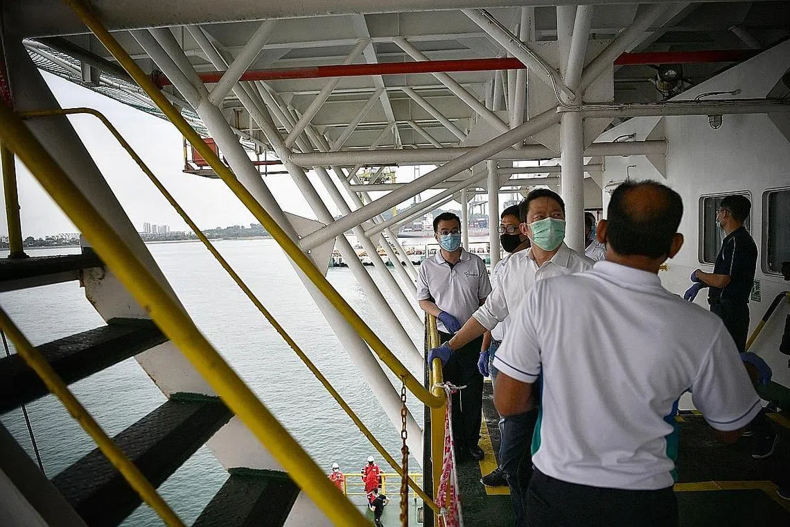 LAKUKAN LAWATAN: MENTERI Negara Kanan (Pengangkutan merangkap Kesihatan), Dr Lam Pin Min, mengunjungi tempat penginapan terapung di Terminal Tanjong Pagar yang digunakan sebagai perumahan alternatif buat pekerja asing yang sihat kelmarin.