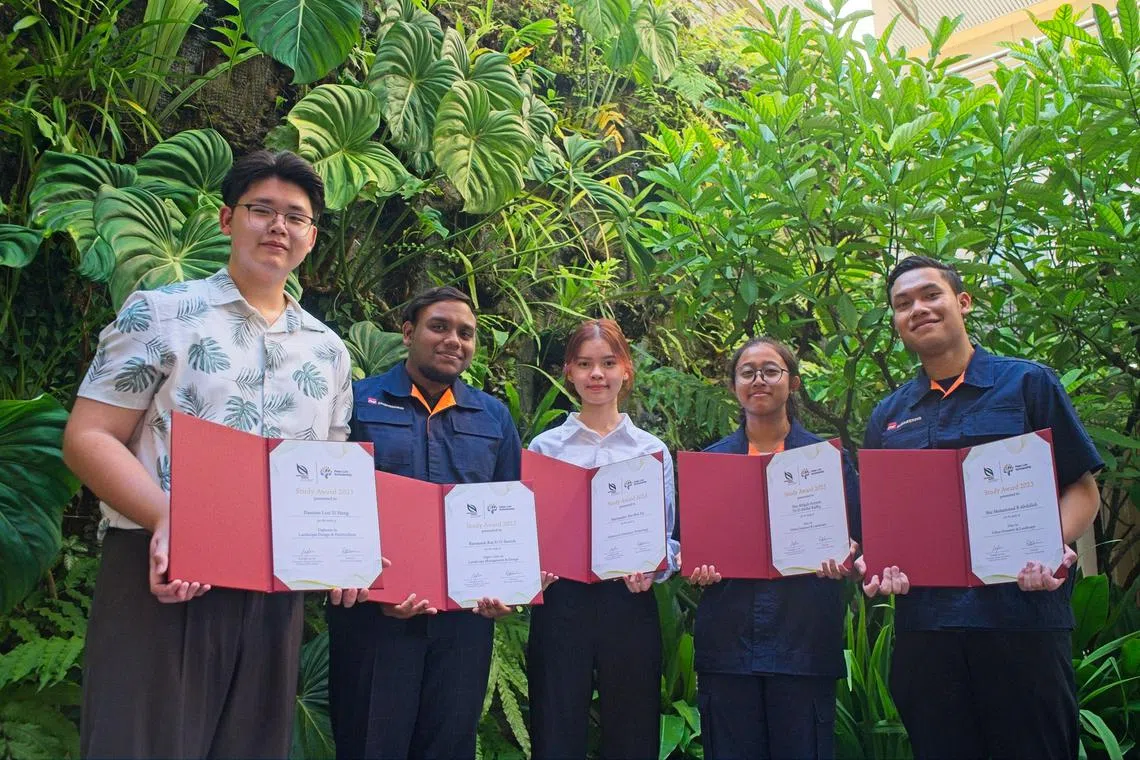 Encik Nur Mohammad Abdullah, 21 tahun (kanan), dan Cik Nur Rifqah Asyura Abdul Raffiq (dua dari kanan), 19 tahun, pelajar dari Kolej East Institut Pendidikan Teknikal (ITE), adalah antara lebih 220 individu muda yang telah dianugerahkan geran pengajian di bawah Biasiswa NParks-Peter Lim. - Foto NPARKS