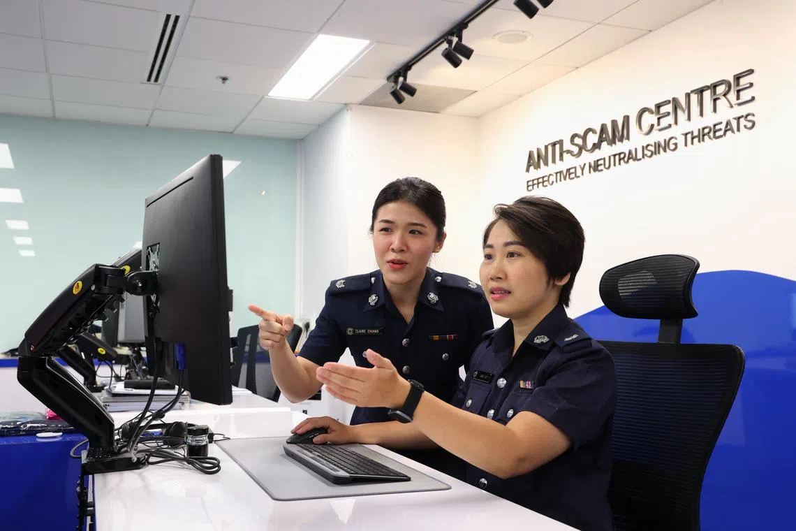 PANTAU KES PENIPUAN: Penolong Superintenden Polis (ASP) Claire Chiang (kiri) dan ASP Joan Liu (kanan) memantau laporan polis tentang kes penipuan yang difailkan mangsa di Pusat Anti-Penipuan (ASC) di Police Cantonment Complex. - Foto LIANHE ZAOBAO