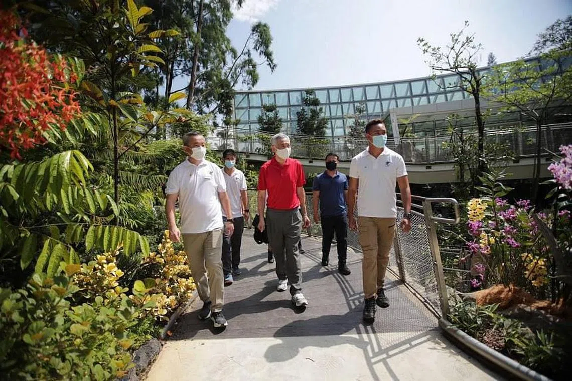 (tengah) Perdana Menteri ee Hsien Loong dan (dua dari kanan) Menteri Pembangunan Negara, Encik Desmond Lee, sedang bersiar-siar di pameran, Tropical Montane Orchidetum di Taman Orkid Negara. - GIN TAY