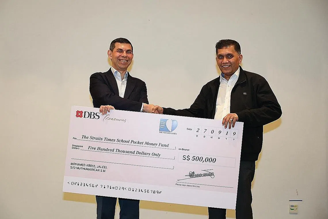 SUMBANGAN BERMAKNA: Encik Jaleel (kanan) menyumbang $500,000 lagi kepada Dana Wang Saku Sekolah The Straits Times (STSPMF) yang diterima oleh Encik Fernandez. - Foto BH oleh ONG WEE JIN -