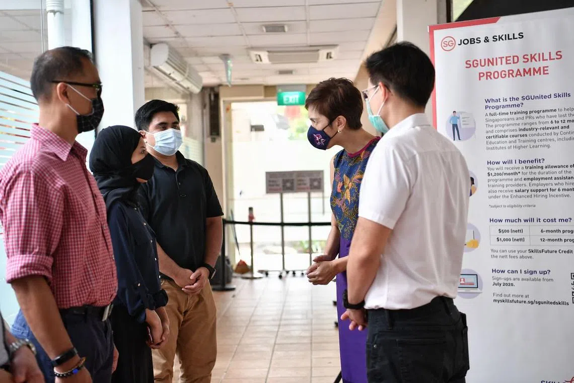 BANTU PEMOHON KERJA: Menteri Tenaga Manusia, Cik Josephine Teo, bersama Anggota Parlimen GRC Tampines, Encik Desmond Choo, beramah-tamah bersama tiga pemohon kerja, termasuk Cik Siti Aisyah (dua dari kiri), di acara temu ramah kerja yang dianjurkan WSG di Kelab Masyarakat Tampines Changkat. - Foto BH oleh ARIFFIN JAMAR