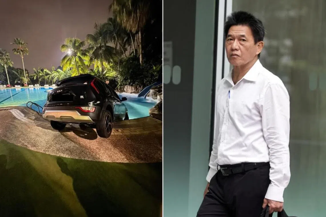 Seorang lelaki yang memandu keretanya ke dalam kolam renang Seletar Country Club dua kali dalam masa lapan minit dijatuhi hukuman penjara selama enam minggu.