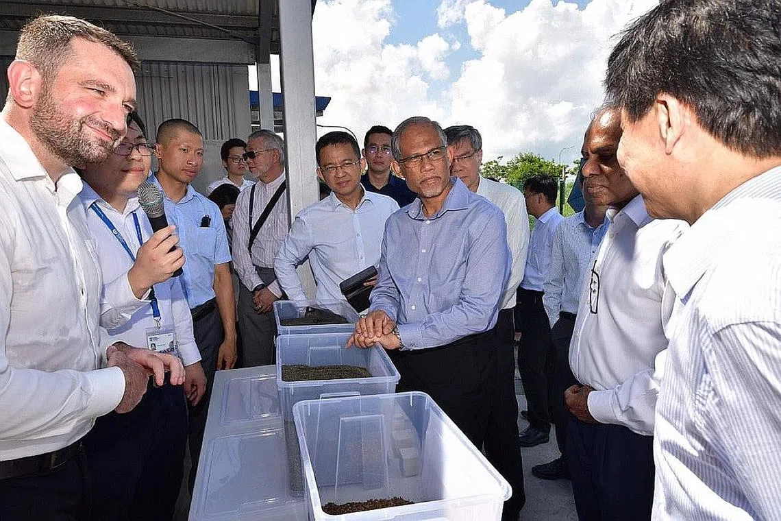 PANDANG KE HADAPAN: Encik Masagos (memegang bekas plastik) mendengar taklimat seorang pegawai berkenaan proses mengubah sisa menjadi sumber berguna. - Foto CMG -