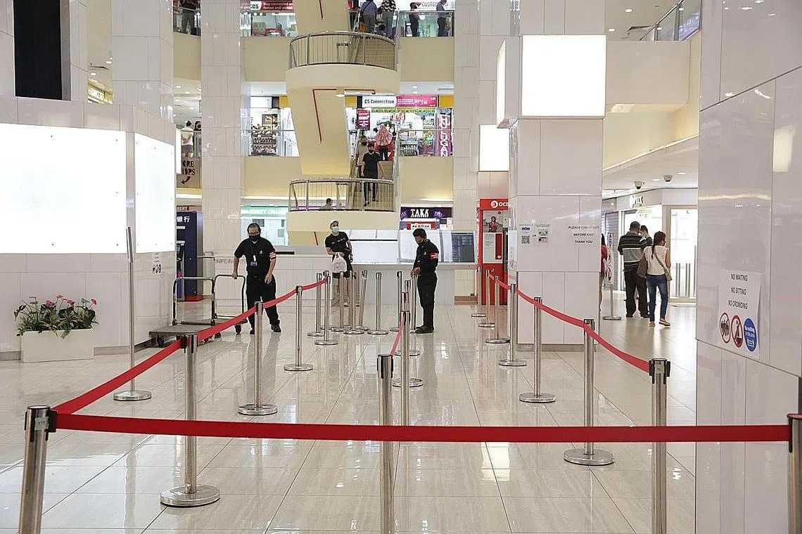 PUSAT beli-belah popular seperti Lucky Plaza (gambar kanan) dan Peninsula Plaza bersiap menerima kunjungan dengan sekatan kemasukan hari ganjil dan genap hari ini. Ia sebahagian langkah baru yang diperketat, yang diumumkan Pasukan Bertindak Berbilang Kementerian (MTF) kelmarin ekoran kes masyarakat yang meningkat.