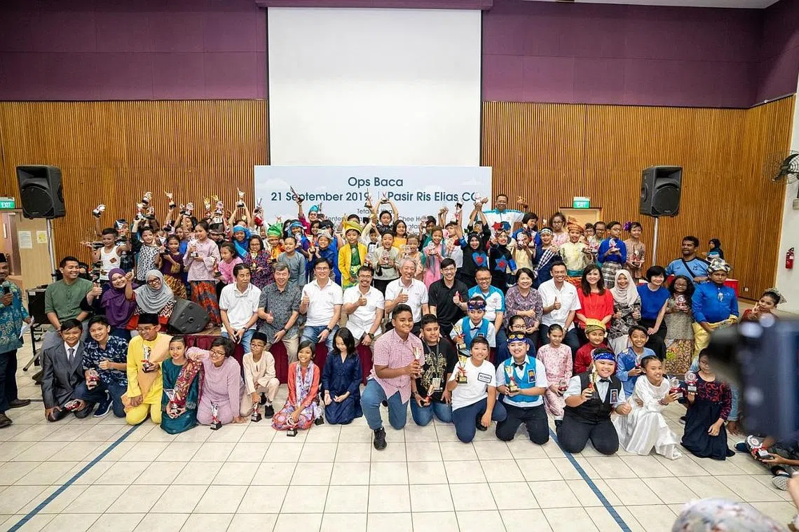 GALAK GUNA BAHASA MELAYU: Encik Zainal Sapari dan Menteri Kanan, Encik Teo Chee Hean, bersama anggota jawatankuasa M3@Pasir Ris dan MAEC Kelab Masyarakat Pasir Ris Elias bergambar beramai-ramai dengan peserta 'Ops Baca' - pertandingan bercerita dalam bahasa Melayu bagi pelajar sekolah rendah yang diadakan sempena Pesta Pembelajaran M3@Pasir Ris pada September lalu. - Foto M³@PASIR RIS-PUNGGOL -