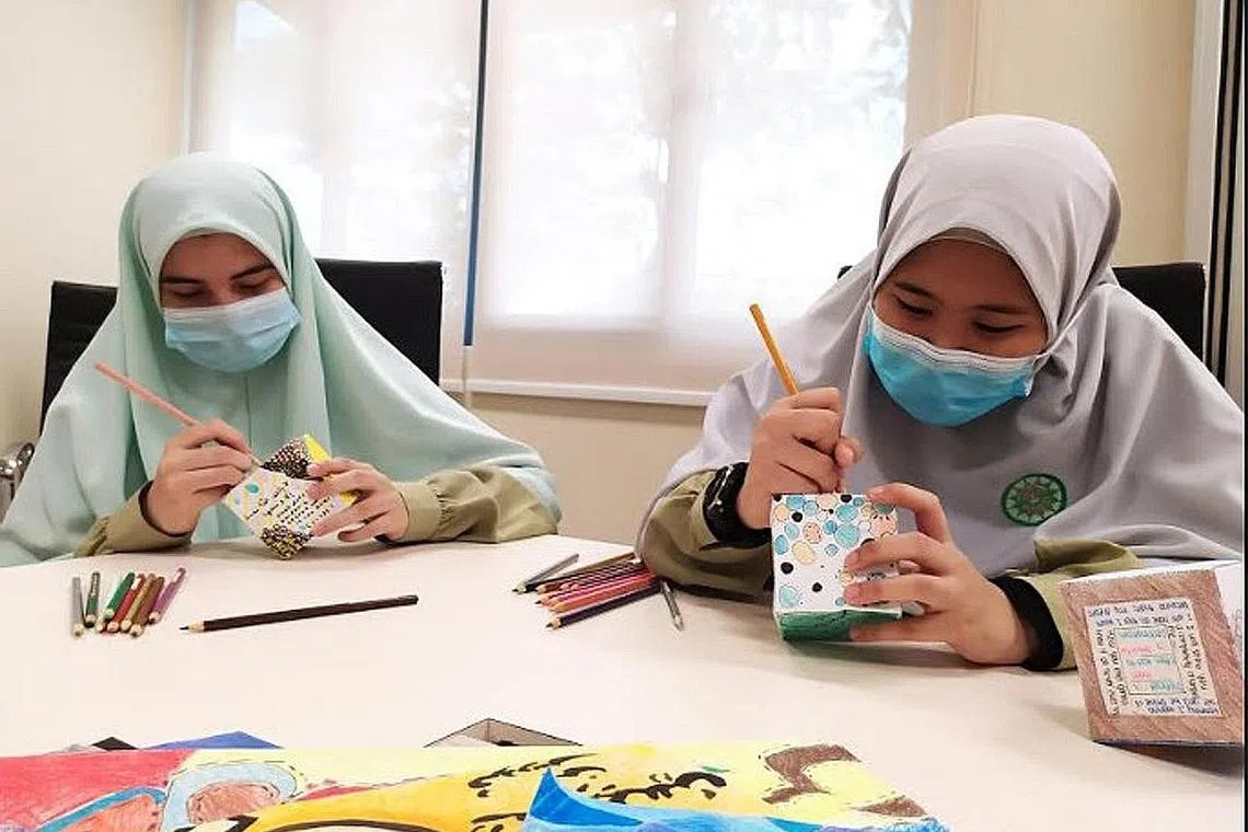 KARYA SENI: Pelajar menengah dua MAI, Salwa Sanaullah Khan (kiri) dan Nur Sumayyah Mohammad Zaki (kanan) menggunakan bahan mewarna kering - pensel warna, krayon dan penanda untuk mereka karya seni Cube Art. - Foto MAI -