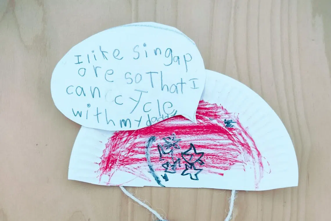 “I like Singapore so that I can cycle with my daddy.” (Saya suka Singapura supaya saya dapat berbasikal dengan ayah saya.)