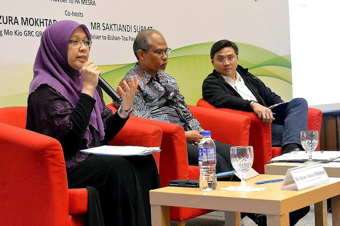 MEMBANGKIT SEMANGAT, HARUNGI CABARAN: (Dari kiri) Dr Intan Azura Mokhtar, Encik Masagos Zulkifli Masagos Mohamad dan Encik Saktiandi Supaat dalam majlis Dialog Pasca Belanjawan anjuran Majlis Penyelaras Kumpulan-kumpulan Kegiatan Melayu Persatuan Rakyat (Mesra) di The Grassroot Club, Ang Mo Kio, kelmarin. - Foto BH oleh M.O.SALLEH -