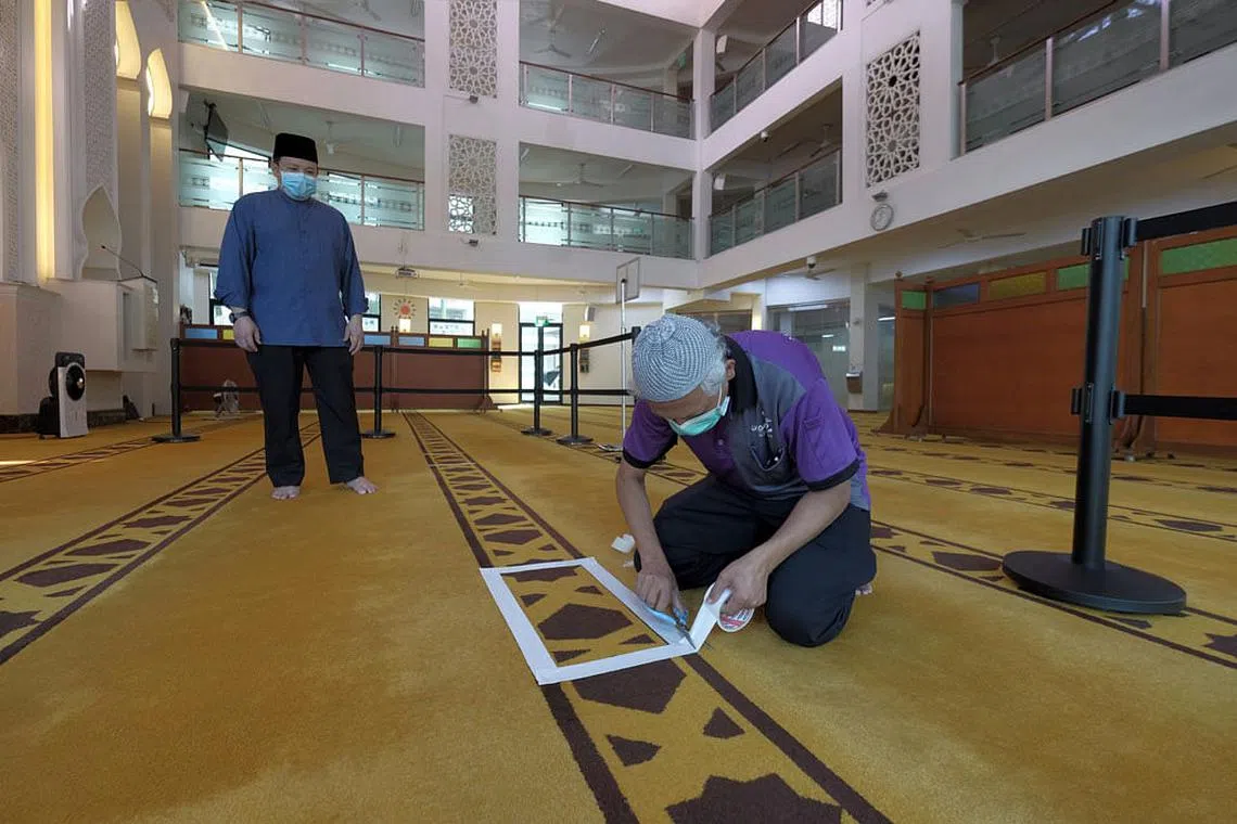 PERSIAPAN BERJALAN LANCAR: Kakitangan Masjid Mujahidin sedang menyiapkan ruang solat mengikut garis panduan yang diberikan oleh Muis menjelang pembukaan semula masjid-masjid di Singapura Selasa depan. Kotak putih yang dilekatkan di permaidani dalam zon individu menandakan tempat jemaah individu berdiri, pada jarak dua meter dari jemaah lain. Kawasan yang dikepung dengan papan pula diperuntuk bagi zon isi keluarga. Sehingga lima individu dibenarkan berada satu zon solat pada satu masa. - Foto BH oleh GAVIN FOO -