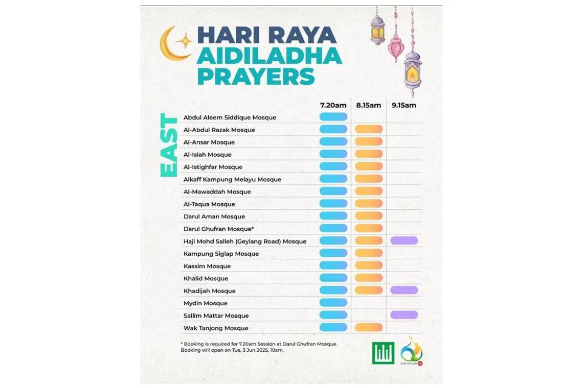 Mereka yang ingin melakukan solat Aidiladha di Masjid Darul Ghufran di Tampines pada sesi pertama iaitu pada 7.20 pagi mesti membuat tempahan slot melalui book.masjids.sg.