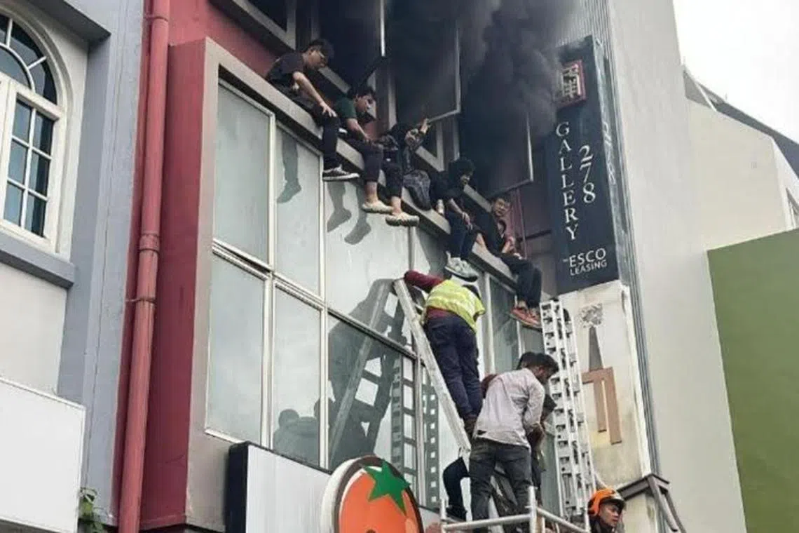 Pegawai SCDF menggunakan tangga untuk menyelamatkan diri mereka yang duduk di belebas bangunan, manakala sebahagian lagi bergegas ke tingkat dua dan tiga.