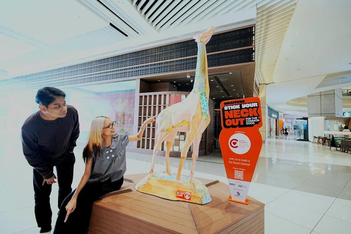 Menerusi satu kerja seni berupa bangku berarca zirafah di pusat membeli-belah Suntec City, Nur Iman Sumani, dan Diamond Nabilah Misson, cuba menyampaikan pesanan tersirat buat masyarakat renungi dalam Kempen GiraffeSG@Central, anjuran Majlis Pembangunan Masyarakat (CDC) Central Singapore.