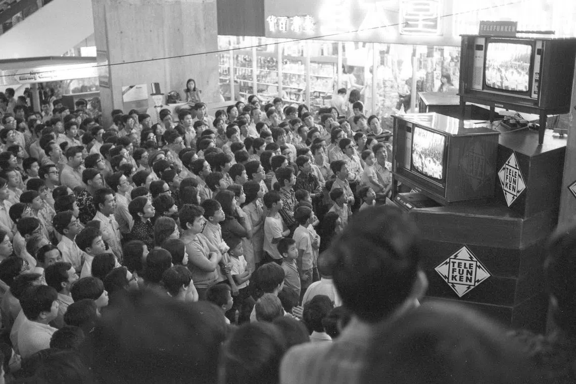 Penonton buat kali pertama menyaksikan siaran langsung Perbarisan Hari Kebangsaan (NDP) 1974 secara berwarna di televisyen. Gambar menunjukkan keadaan di People’s Park Complex ketika itu. - Foto fail