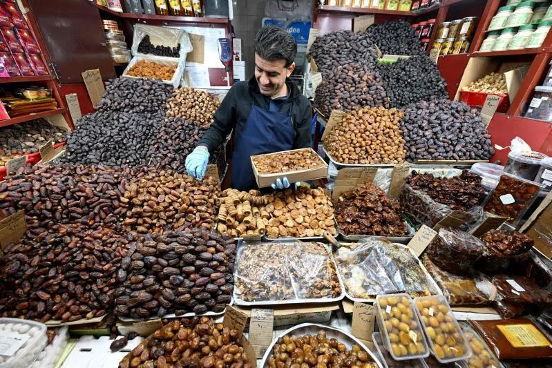 Tersusun rapi kurma-kurma di pasar pusat bandar Kuwait City, sedia untuk jualan pada 18 Februari 2026, hari pertama Ramadan. Kurma menjadi pilihan utama umat Islam untuk berbuka puasa, mengikut sunnah Nabi Muhammad saw. - Foto AFP