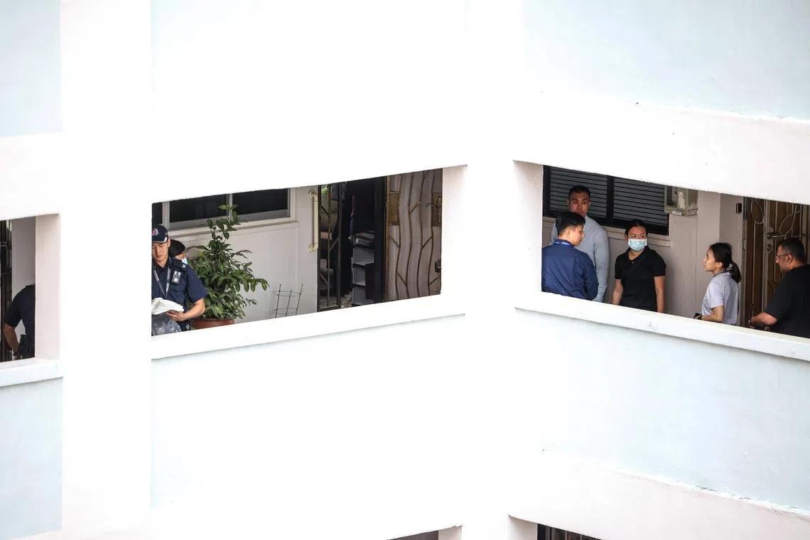 Kira-kira 10 pagi, ketika The Straits Times tiba, sekurang-kurangnya tiga kereta polis dan sebuah van polis kelihatan di tempat letak kereta berhampiran blok itu.