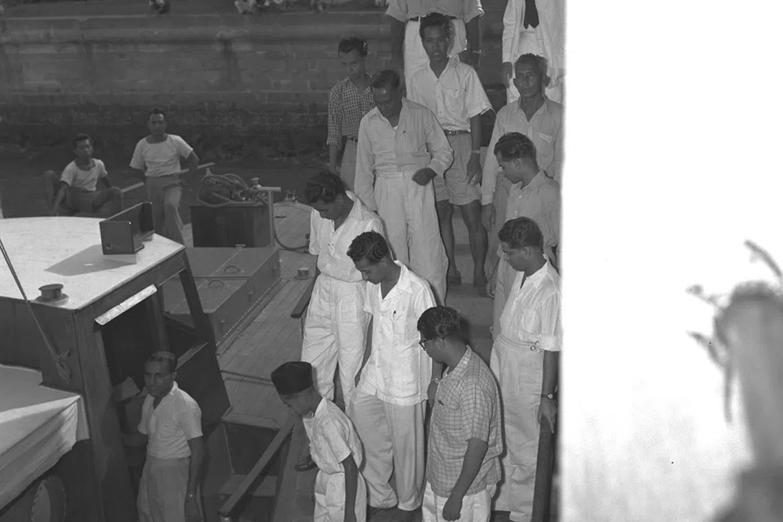 Anggota Persatuan Dakwah Islamiah SeMalaya bergerak untuk menaiki bot ke Rumah Api Sultan Shoal untuk melihat anak bulan dan mengesahkan 1 Syawal akan tiba pada hari selanjutnya. Anak bulan pada malam itu kali pertama dilihat dari Mount Faber. Gambar ini pertama kali diterbitkan pada 24 Jun 1952. - Foto ST