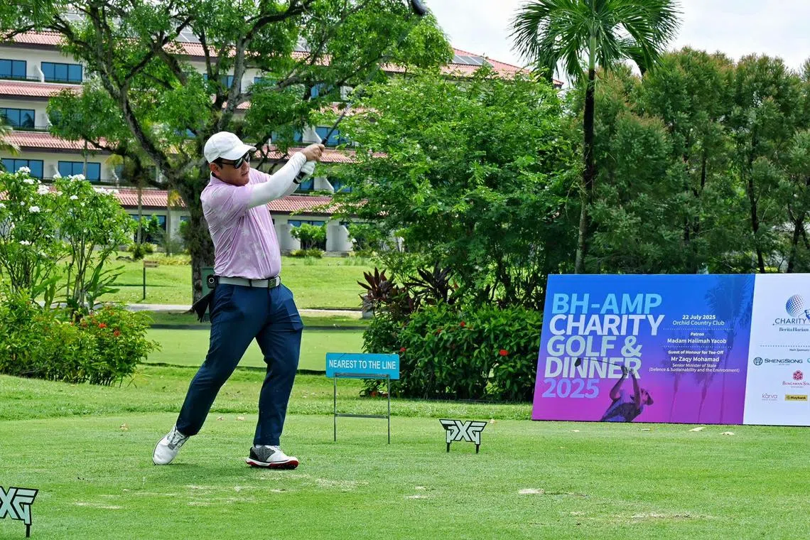 Menteri Negara Kanan (Pertahanan merangkap Kemampanan dan Sekitaran), Encik Zaqy Mohamad, semasa melakukan pukulan permulaan (tee-off) dalam acara Golf Amal dan Jamuan Malam BH-AMP 2025 di Orchid Country Club pada 22 Julai. - Foto BH oleh KHALID BABA