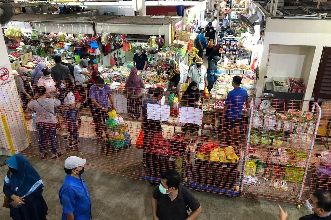 Semasa BM di pasar semalam, para pegawai Agensi Sekitaran Kebangsaan (NEA) yang bertugas memastikan pasar tidak terlalu sesak, sambil mengingatkan orang ramai yang beratur untuk sentiasa memakai pelitup dengan betul