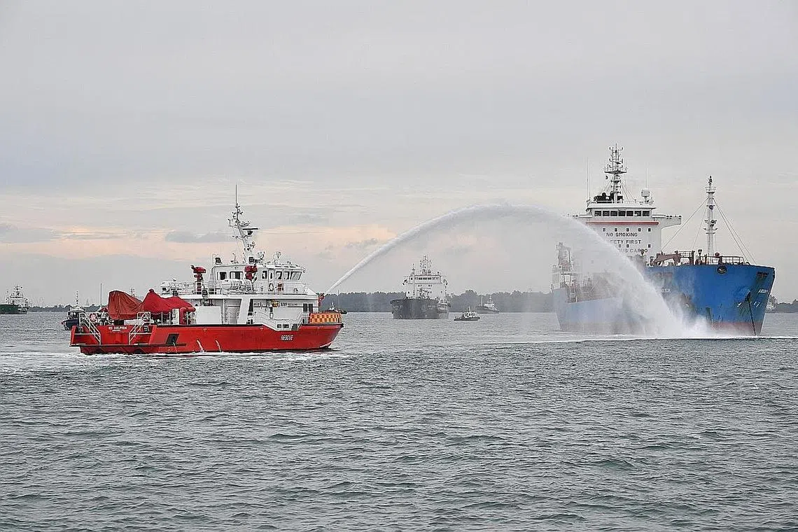 LATIHAN TUMPAHAN MINYAK: Kapal tangki minyak (kanan) yang menumpahkan minyak disimbah air oleh kapal Mass Rescue Vessel dan Rapid Response Fire Vessel SCDF sewaktu latihan tumpahan minyak secara bersama semalam. - Foto BH oleh CHONG JUN LIANG -