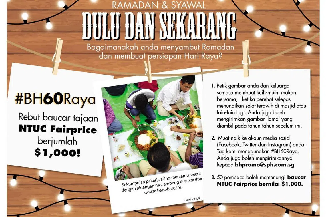 Berita Harian akan menerbitkan gambar berkaitan persiapan Ramadan dan Hari Raya di laman media sosial (Facebook, Instagram, Twitter) dengan menggunakan tanda hash #BH60Raya.