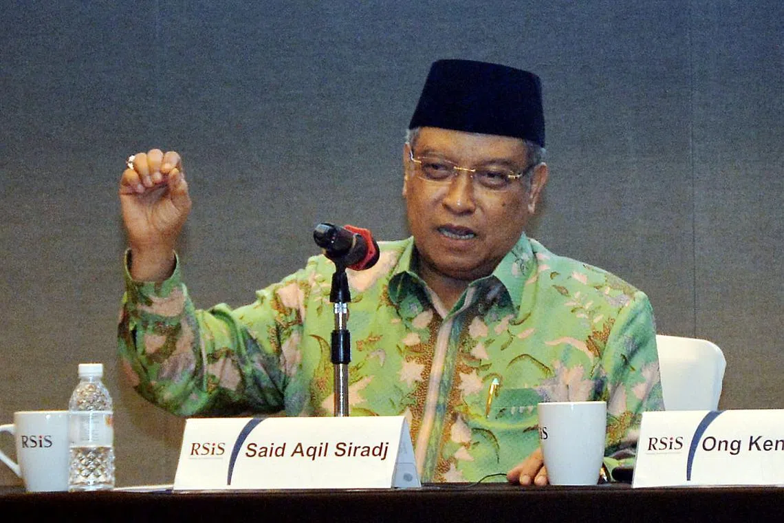 PERTEGUH PRINSIP SEDERHANA: Pengerusi Nahdlatul Ulama Indonesia, Dr Kyai Said Aqil Siradj, menyampaikan ceramah anjuran RSIS mengenai usaha pertubuhan itu memupuk kesederhanaan dan toleransi, di Sheraton Towers baru-baru ini. - Foto KHALID BABA -