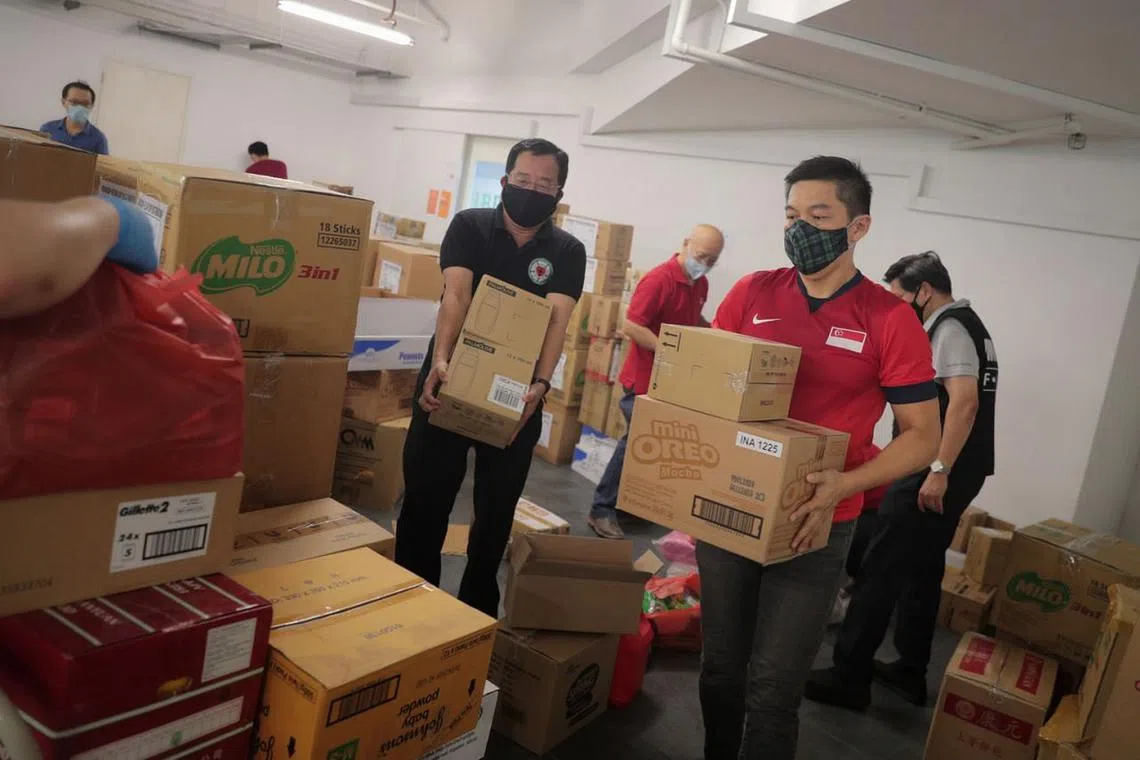 KEBAJIKAN DIJAGA: Encik Tan Chuan-Jin (kanan) bersama sukarelawan menyiapkan pek penjagaan kepada pekerja asing di Bible House di Armenian Street semalam. - Foto BH oleh JASON QUAH -