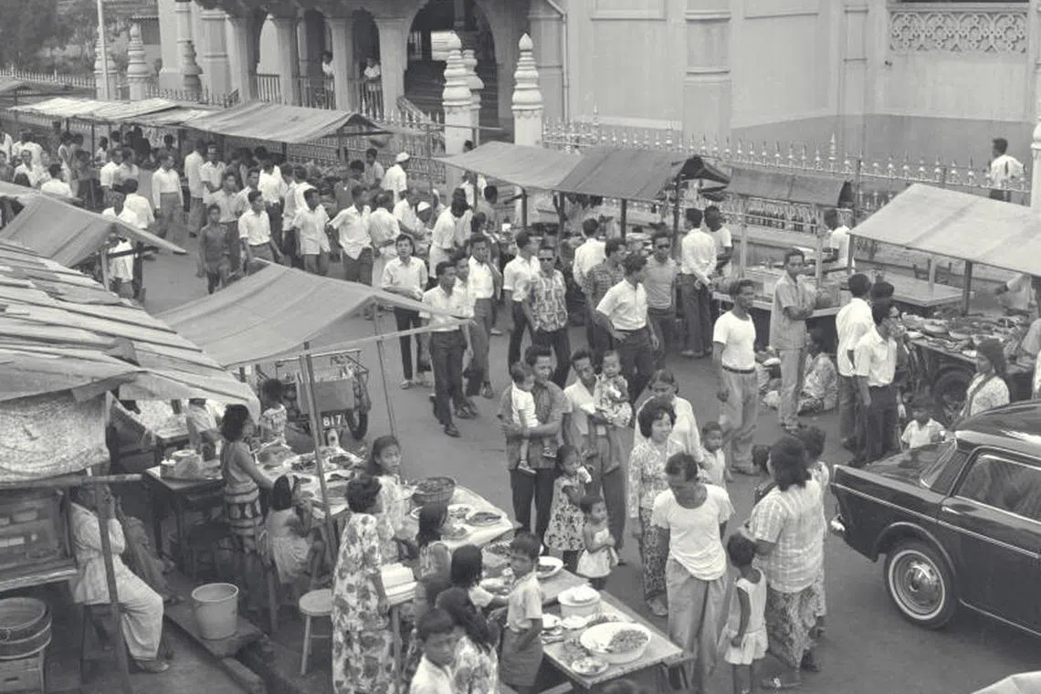 Orang ramai sibuk memilih dan membeli kuih-muih serta makanan lain dari gerai sementara di kawasan Kampung Jawa yang diadakan semasa Ramadan, dalam gambar yang dirakamkan pada 1965 ini. Tradisi menjual makanan di jalan raya sekitar Masjid Sultan terus diadakan sehingga kini.