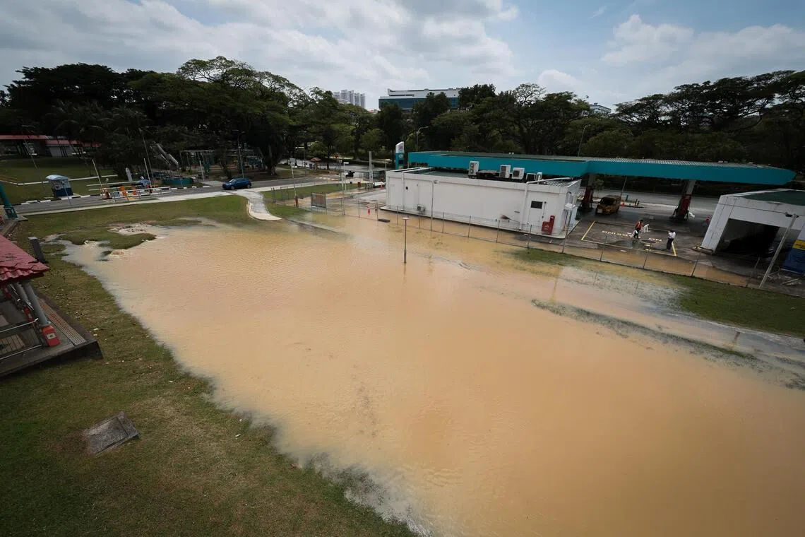 Paip yang bocor dekat Blok 222, Ang Mo Kio Ave 1 menyebabkan air melimpah ke stesen minyak SPC berdekatan, kata agensi air negara PUB pada 11 Januari.