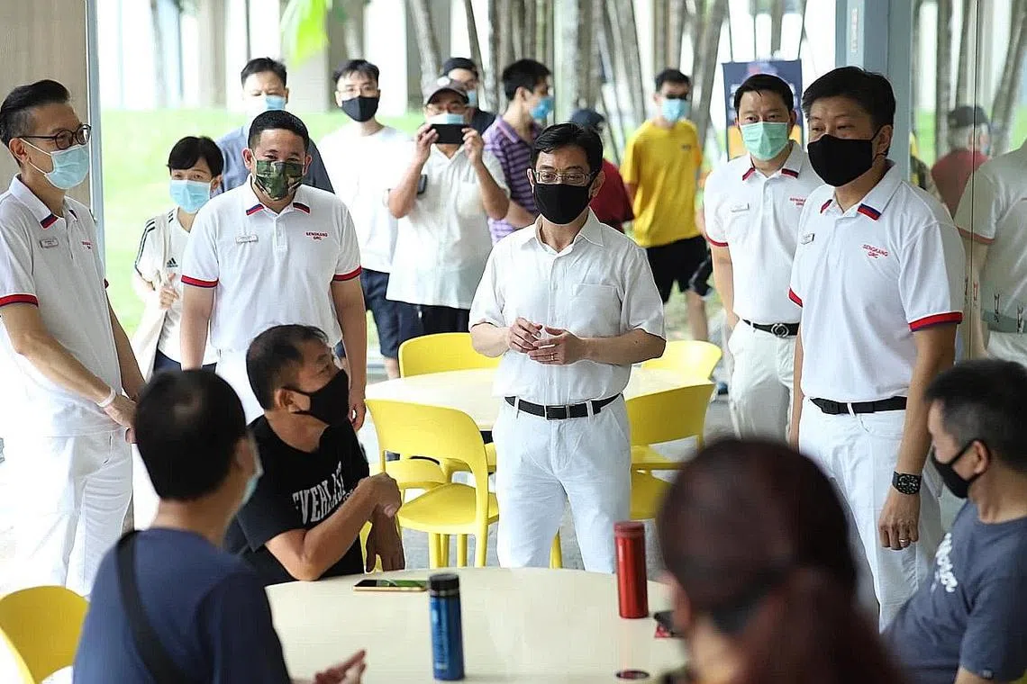 PASUKAN UTUH: Timbalan Perdana Menteri Heng Swee Keat (tengah), menyertai Encik Ng Chee Meng (kanan), Dr Lam Pin Min (dua dari kanan), Encik Amrin Amin (dua dari kiri) dan Encik Raymond Lye (paling kiri), semasa mengunjungi Compassvale pada 28 Jun lalu. - Foto: FACEBOOK/NGCHEEMENGFORSG -