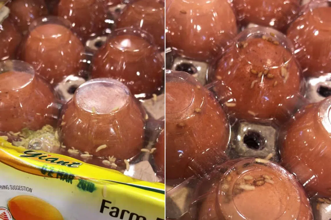 ULAT DALAM BUNGKUSAN TELUR: Bungkusan telur di pasaraya Giant Tampines dikatakan berulat, menurut video yang tersebar di media sosial. - Foto FACEBOOK/LEONARD TANG -
