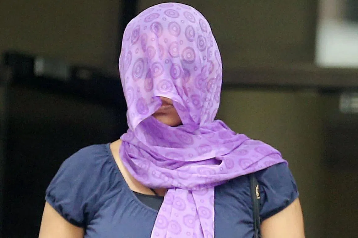 HUKUMAN PENJARA: Kalaivani Kalimuthu menutup mukanya di luar mahkamah pada 27 Disember 2018 selepas mengaku bersalah memalsukan kenyataan. Dia semalam dikenakan hukuman penjara lima bulan. - Foto BH oleh WONG KWAI CHOW -