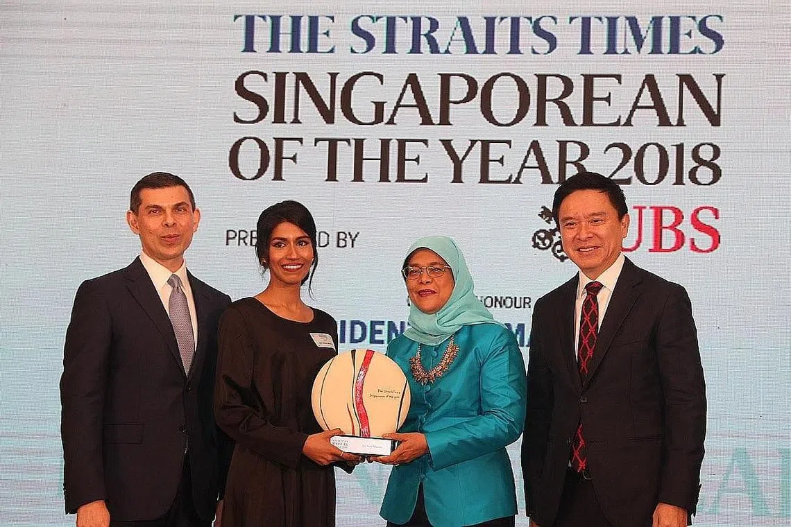 TERIMA PENGIKTIRAFAN: Cik Siti Noor Mastura (dua kiri) terima anugerah Tokoh Singapura The Straits Times 2018 daripada Presiden Halimah. Kiri Ketua Editor Kumpulan Media Inggeris, Melayu, Tamil (EMTM) Singapore Press Holdings (SPH) yang juga Editor The Straits Times, Encik Warren Fernandez. Kanan ialah Encik Edmund Koh, Presiden Asia Pacific UBS Group AG dan UBS AG. - Foto BH oleh TIMOTHY DAVID -
