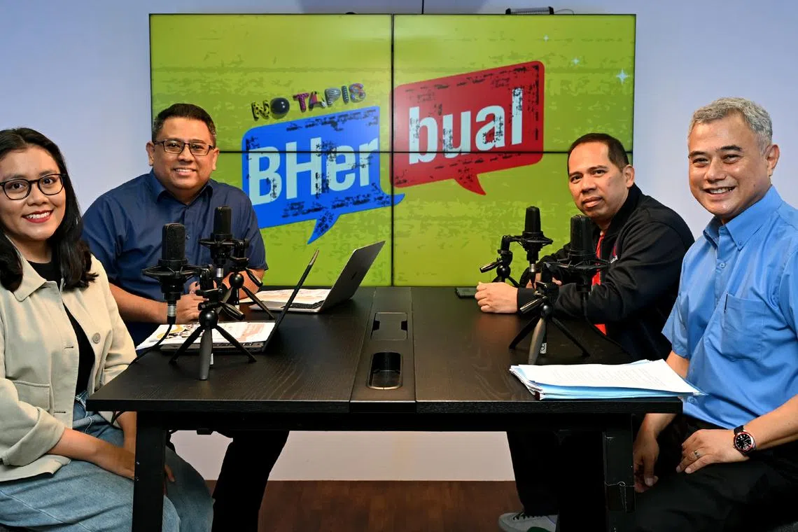 Zamil Penyelidik Kanan di Institut Pengajian Dasar (IPS), Dr Faizal Yahya (kanan) dan juga Naib Presiden, Kongres Kesatuan Sekerja Kebangsaan (NTUC), Encik Abdul Samad Abdul Wahab (dua dari kanan) mengulas tentang Belanjawan 2026 di podcast BHerbual terbitan Berita Harian (BH) pada 13 Februari, bersama Koresponden BH, Cik Irma Kamarudin (kiri), dan Encik Anwar Saleh.