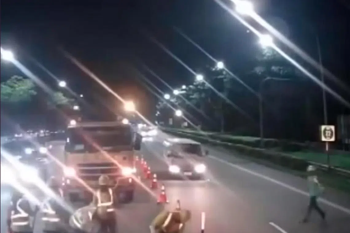 Rakaman yang dikongsi SG Road Vigilante di Facebook pada hari sama menunjukkan lelaki itu berlari dari tepi lebuh raya menuju ke tapak binaan di laluan pertengahan, di mana sekumpulan pekerja migran dilihat sedang bekerja. Namun, sebuah lori melanggarnya.