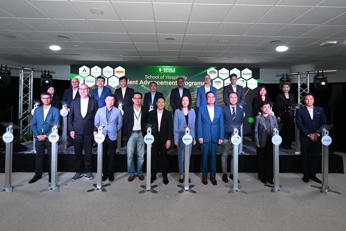 BIMBINGAN PENDIDIKAN DAN KERJA: Pelancaran Program Kemajuan Bakat (TAP) dihadiri tetamu terhormat, Menteri Kedua Pendidikan, Dr Mohamad Maliki Osman (barisan depan, lima dari kiri), serta anggota pengurusan kanan Politeknik Republic dan wakil rakan industri bagi program tersebut. - Foto RP