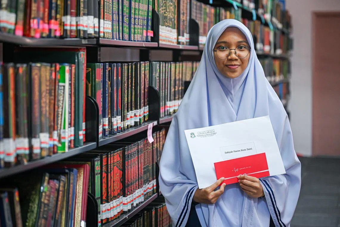 HASIL USAHA GIGIH: Berkat kegigihannya, Zakiyah Hanim Zaini berjaya mendapat tempat ketiga dalam peperiksaan Program Diploma Baccalaureate Antarabangsa (IBDP) 2023 dalam kohortnya di Madrasah Aljunied Al-Islamiah dengan meraih 38 mata. - Foto BM oleh SHAFIQ APANDI