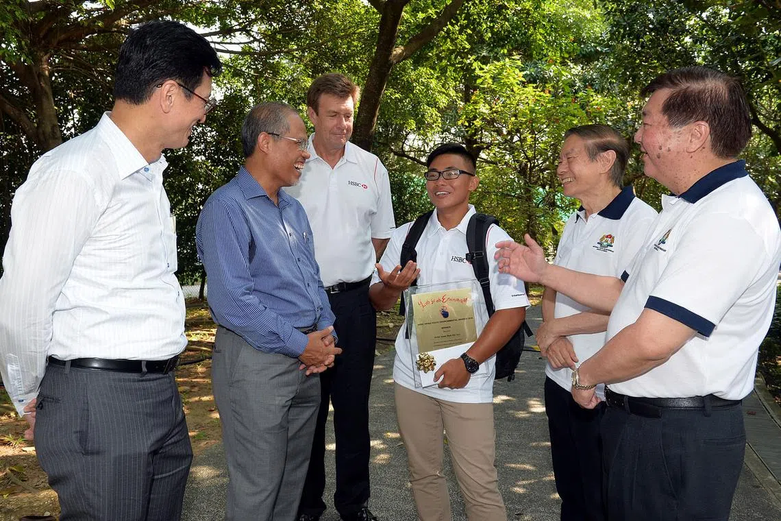 BELIA HARAPAN: Encik Mohd Adam Shah Asri (tiga dari kanan) memenangi Anugerah Alam Sekitar Belia HSBC dan Program Anugerah Pencapaian Belia Kebangsaan (NYAA) atas kepimpinan, sumbangan dan komitmen beliau terhadap alam sekitar. Turut bersamanya (dari kiri) ialah pengetua ITE-nya, Dr Goh Mong Song; Encik Masagos; Encik Guy Harvey-Samuel; Pengerusi NYAA, Profesor Leo Tan; dan Pengarah Eksekutif NYAA, Encik James Soh. - Foto M.O. SALLEH -