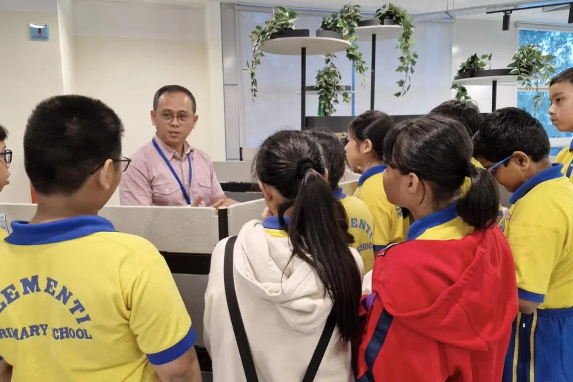 Murid-murid Sekolah Rendah Clementi berpeluang mempelajari selok- belok bidang kewartawanan di Bilik Berita Berita Harian (BH).