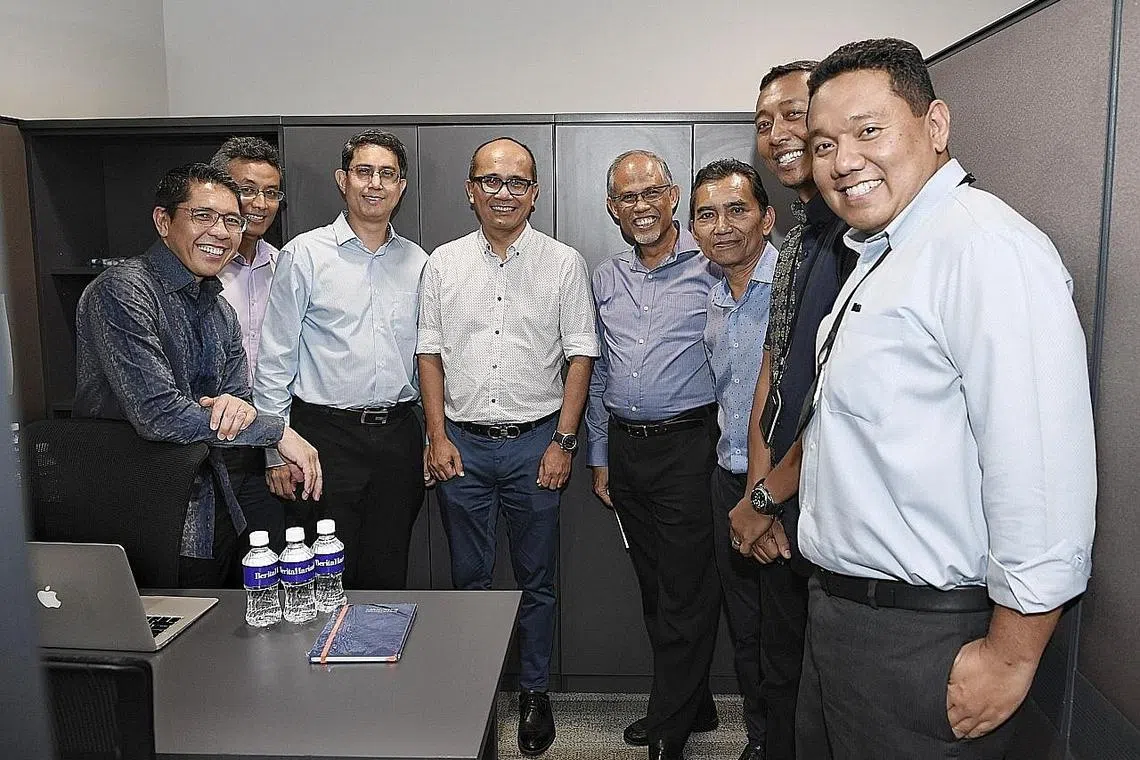 MENDEKATI MASYARAKAT: Dr Maliki (paling kiri); Dr Faishal (tiga dari kiri); Encik Masagos (empat dari kanan); Editor BH/BM Encik Saat A. Rahman (tiga dari kanan); Pengurus Besar WGS, Encik Mulyadi Ahmad (dua dari kanan) bersama kakitangan BH/BM (dari kanan) Encik Chairul Fahmy Hussaini, Encik Mohd Nizam Ismail dan Encik Adli Yashir Kuchit di ruangan Berita Harian di KURNIA@WGS. -