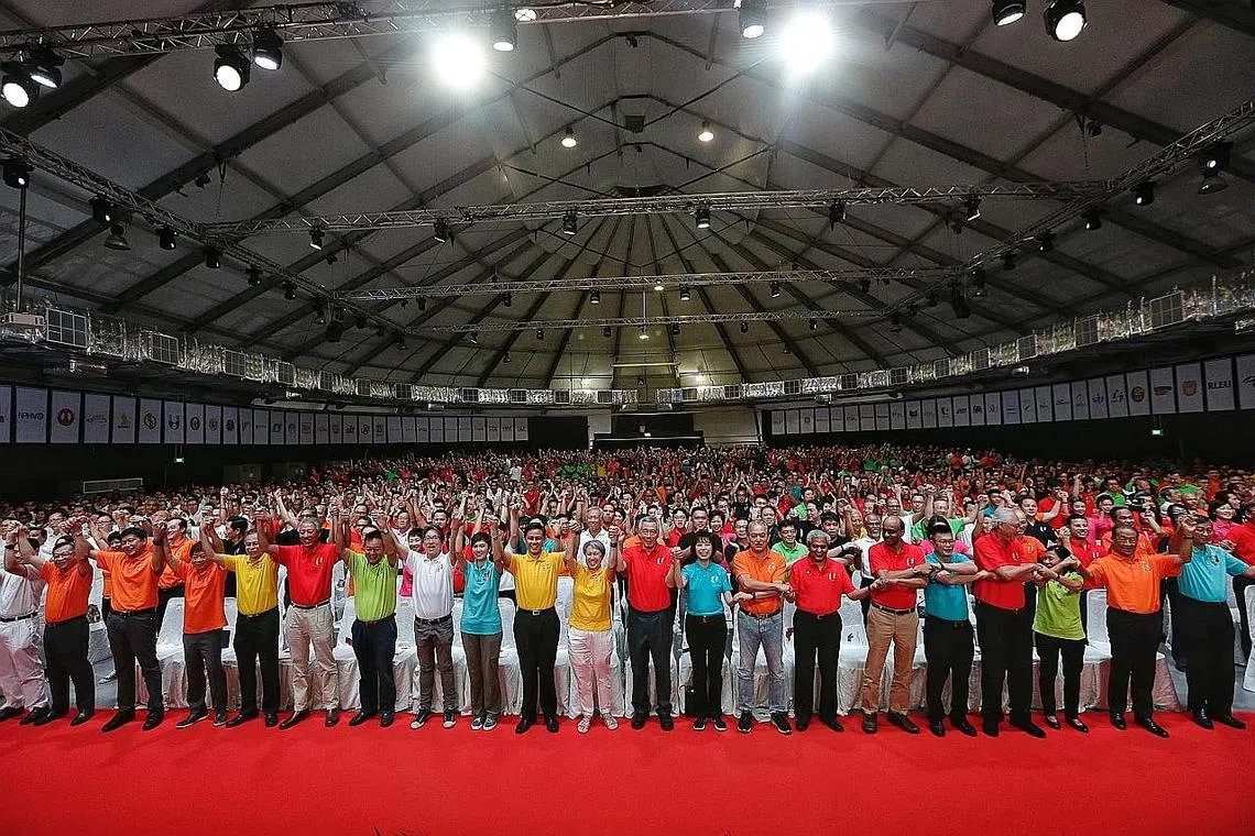 RAPAT HARI PEKERJA: Perdana Menteri Encik Lee Hsien Loong menghadiri Rapat Hari Buruh di D'Marquee Downtown East semalam bersama isterinya Cik Lee, anggota kesatuan, pekerja, majikan, dan anggota Kabinet lain. - Foto BH oleh KEVIN LIM -