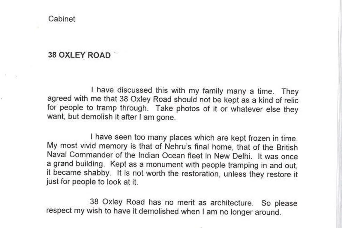 “Pendirian Encik Lee Kuan Yew cukup jelas. Keutamaannya adalah untuk merobohkan hartanah itu. Namun, beliau mengakui bahawa hartanah tersebut tidak wajib dirobohkan, dan memberikan pandangannya tentang cara hartanah itu boleh dipulihara. Semua ini dinyatakan dalam laporan jawatankuasa menteri mengenai 38 Oxley Road, yang diterbitkan pada April 2018.”