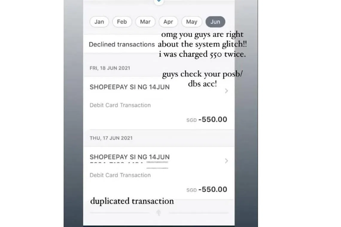 Salah seorang pengguna, Cik Ruzana Rahim yang bekerja sebagai guru sekolah kehilangan $1,100 apabila urus niaga bernilai $550 di Shopee telah dipotong dua kali pada 17 dan 18 Jun.